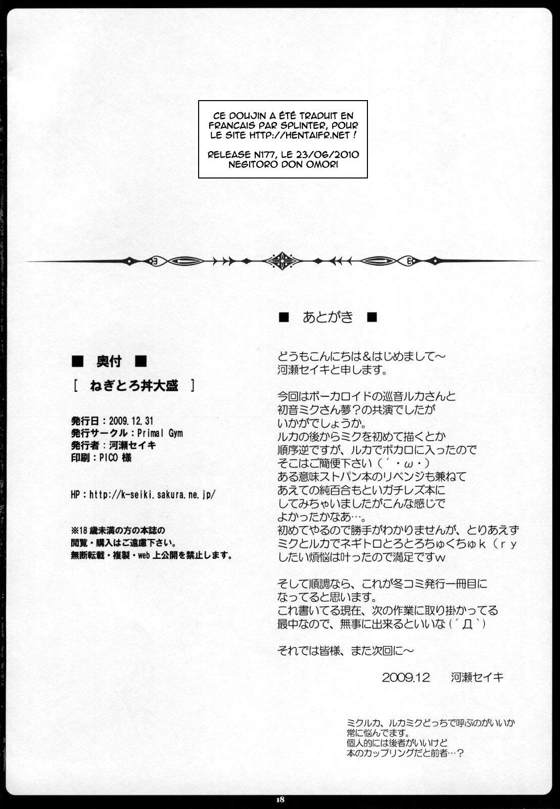 (C77) [Primal Gym (Kawase Seiki)] Negitorodon Oomori (VOCALOID) [French] [HentaiFR]