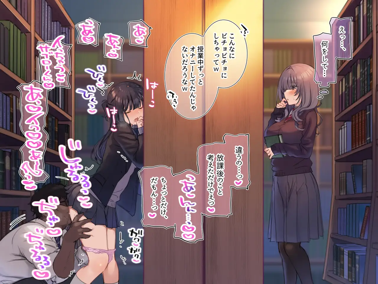 [Mankai Kaika] Toshoshitsu de Sex o Mise Tsukerarete Kakurete Onanie Shichau Onnanoko