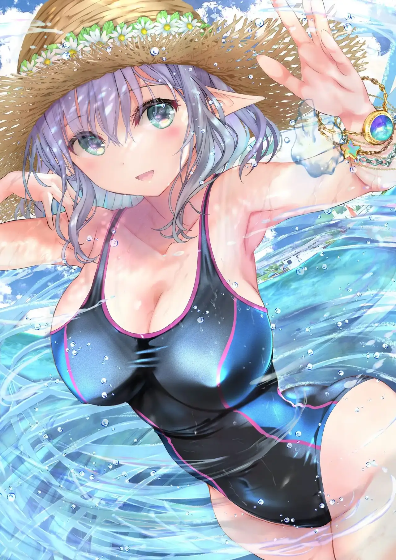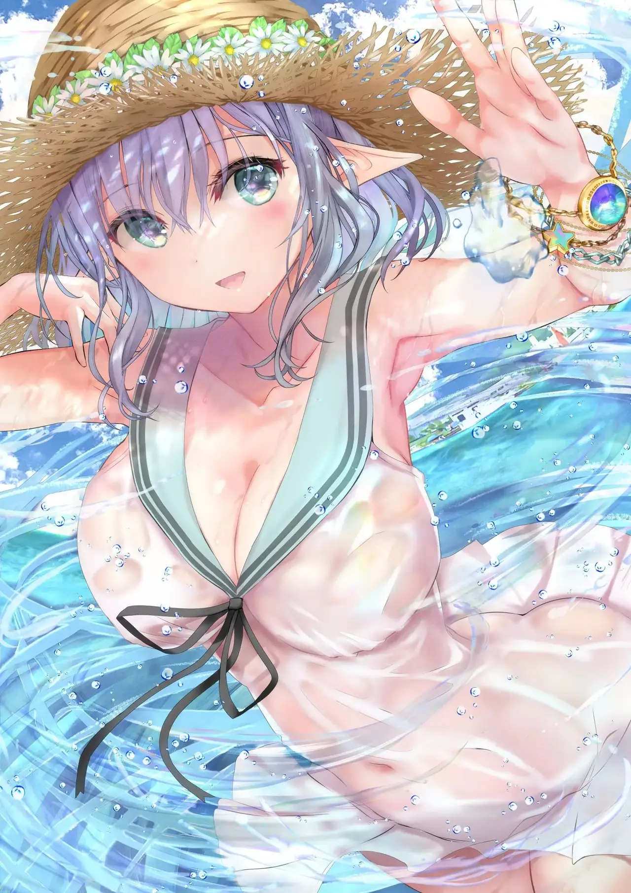 [緒方てい] 濡れ透けセーラーワンピ×競泳水着×水を操るエルフさん