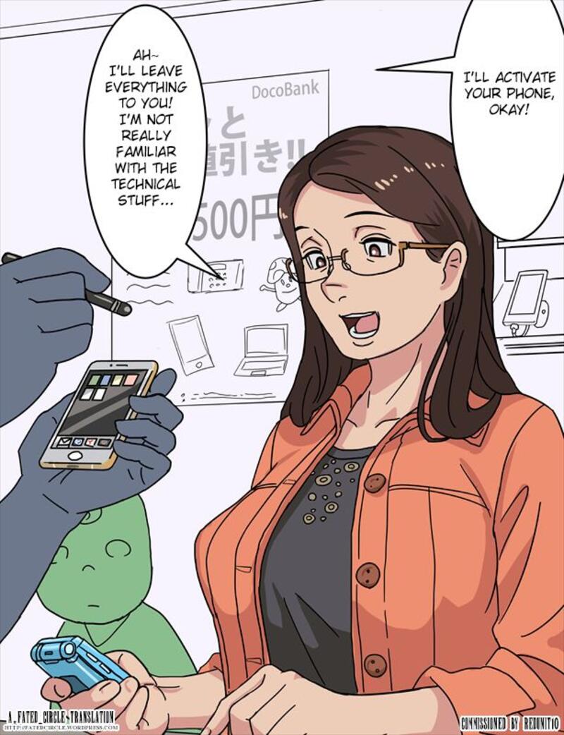 [水島ケロ] スマホ買いに来た人妻にかけまくり [英訳]