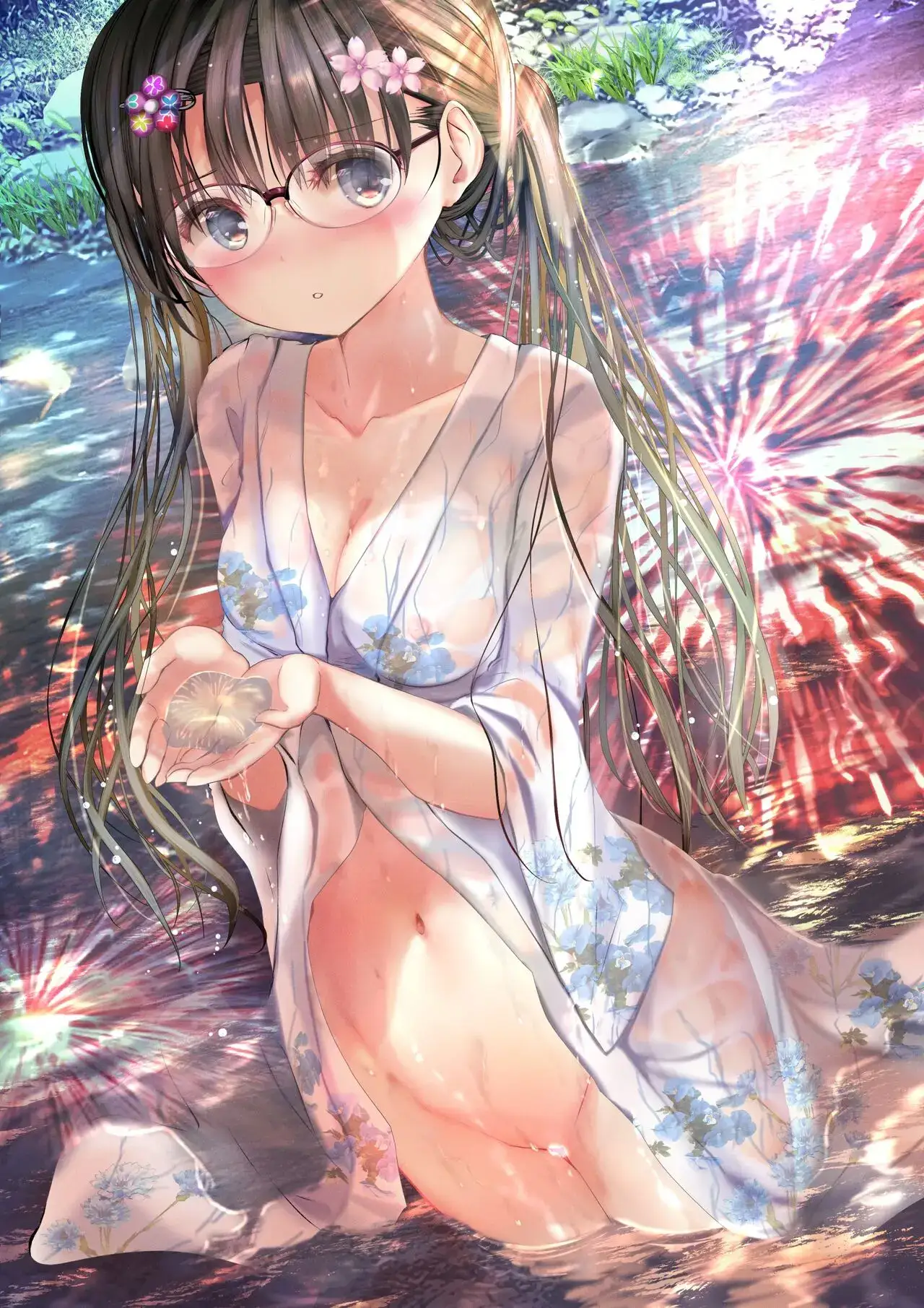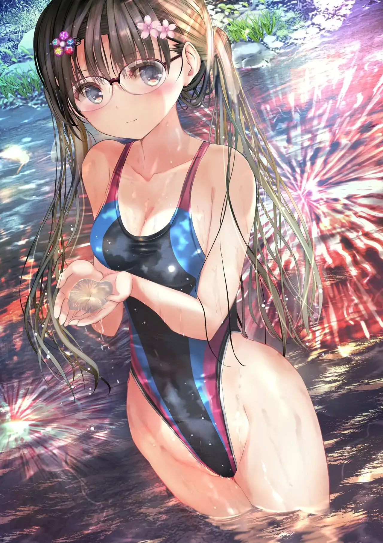 [緒方てい] 田舎の川辺×花火大会×濡れ透け浴衣×競泳水着