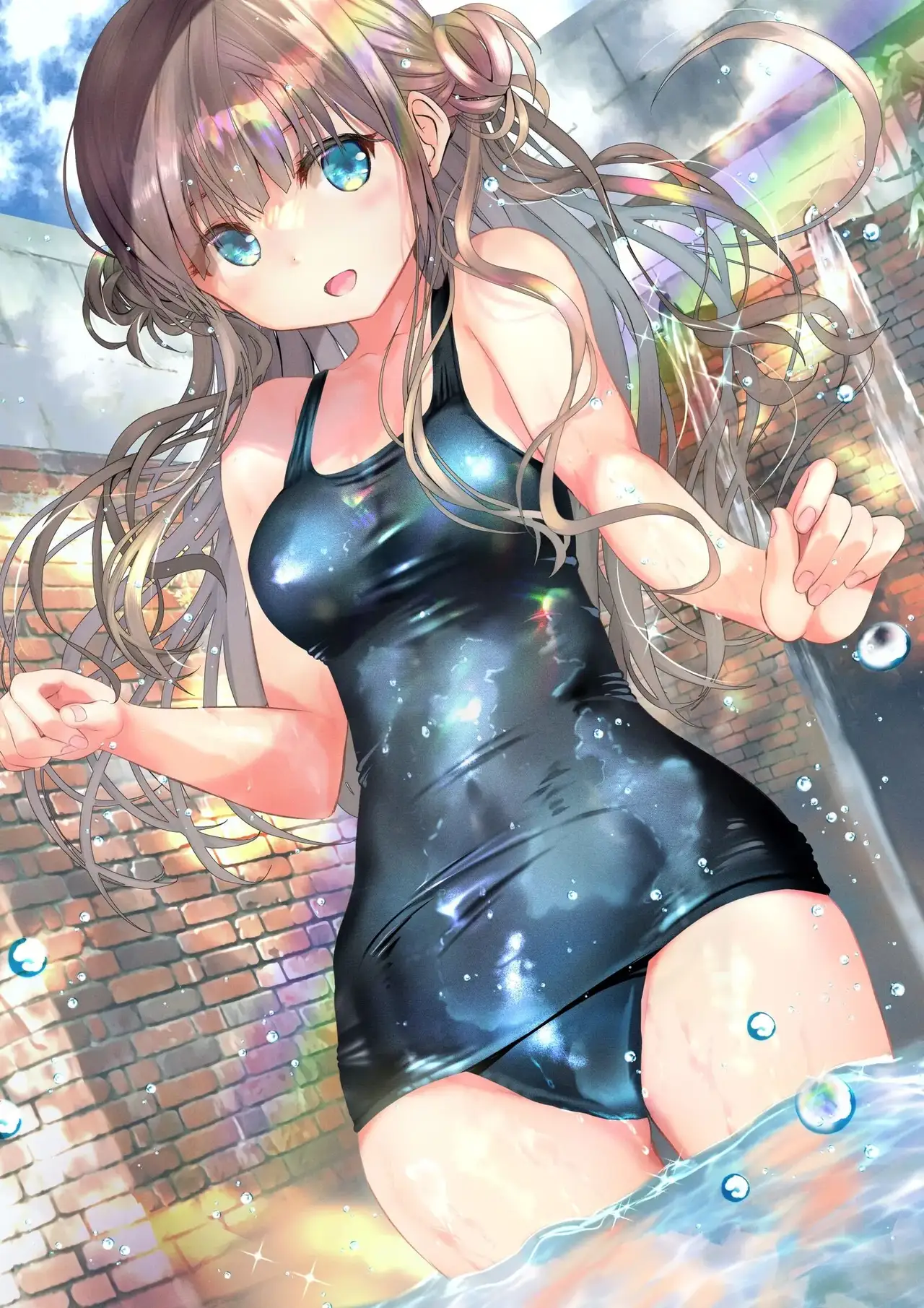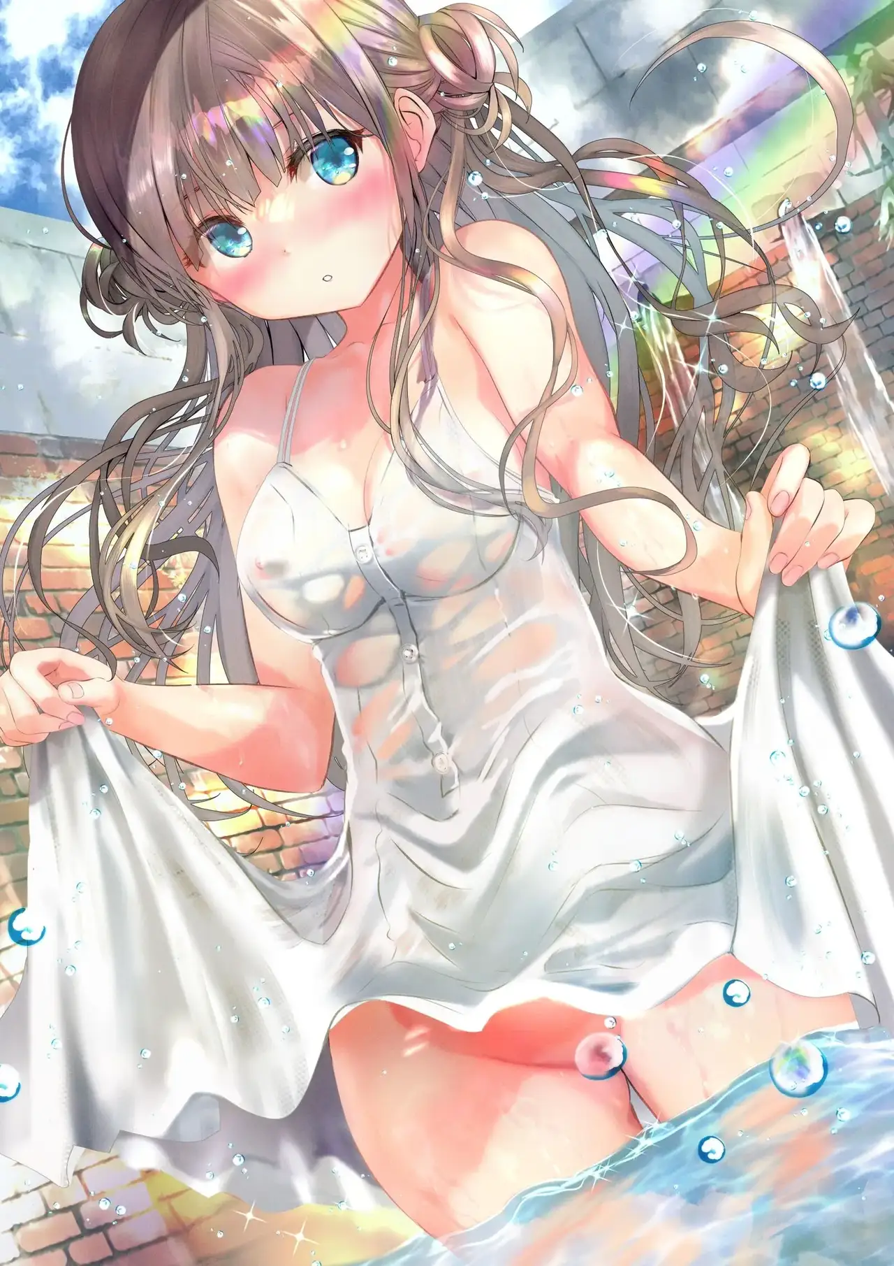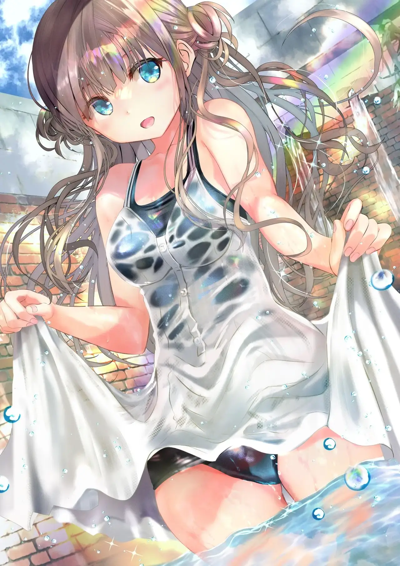 [緒方てい] 虹×水辺×濡れ透け白ワンピスク水さん